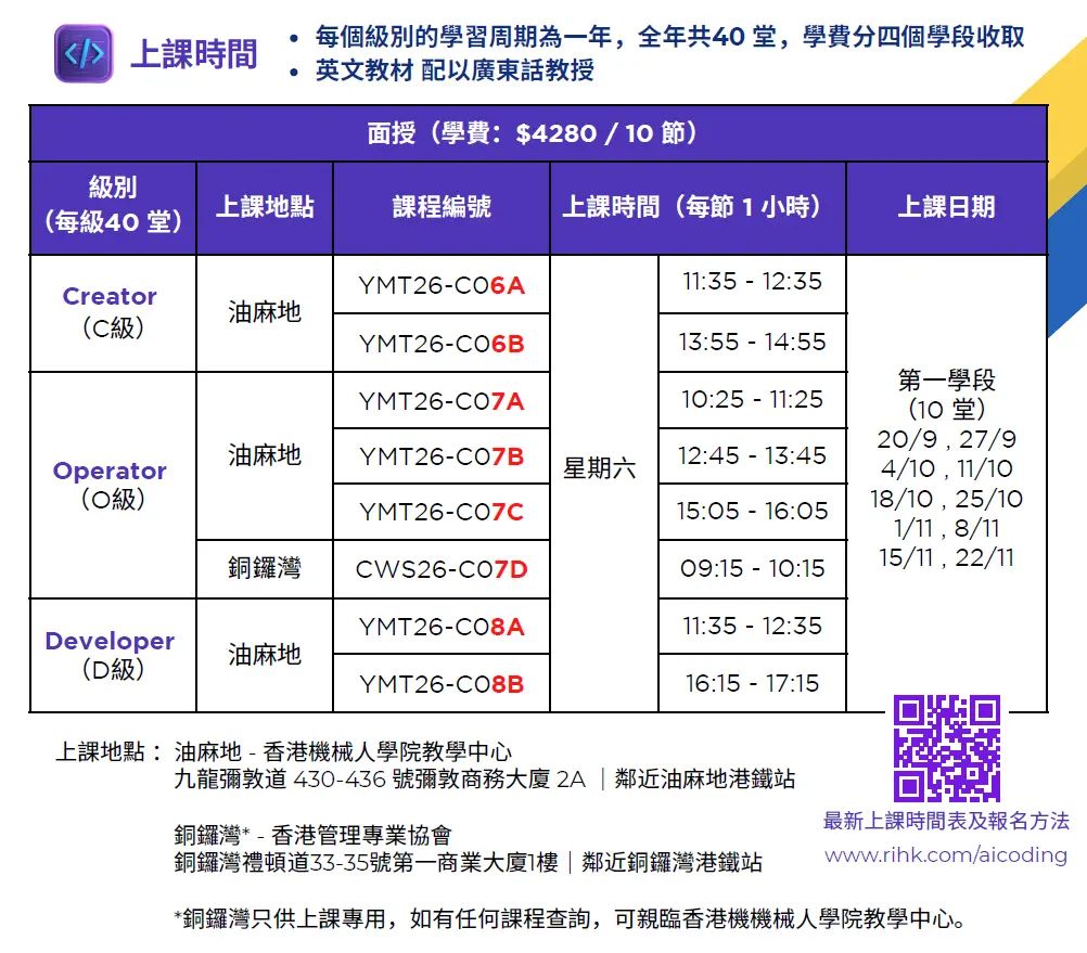 *銅鑼灣只供上課專用,如有任何課程查詢,可親臨香港機械人學院教學中心